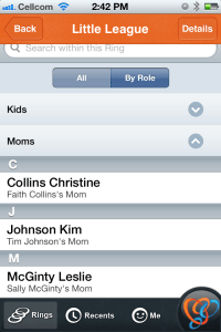 Additionally, you can create groups in Ringya by manually entering contacts, emailing in digital lists, or importing contacts from the address book. On that latter option, I wish there was the ability to select multiple contacts at a time, as it’s tedious to create even small groups that way. Once the groups are in the app, you can then email, text or call members individually, or send a group text, email, or send pictures to the group via email. You can also share the group (the “ring”) with others, and search for members by name or company. When contacts in Ringya call you, the app offers a contextual caller ID option that shows you not just their name, but also who they are to you (title, company, or description, e.g.).