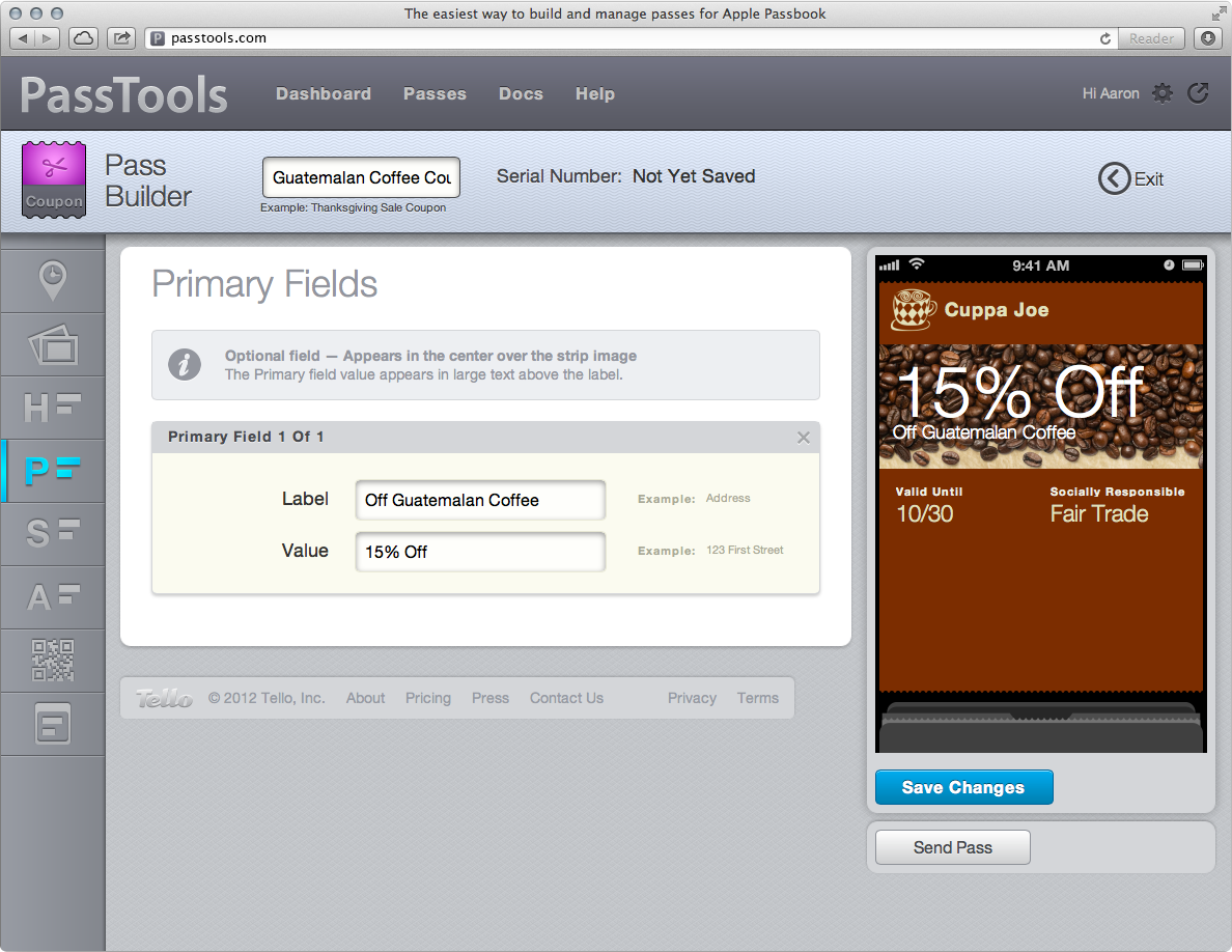 As Tello CEO and founder Joe Beninato told me yesterday, the company worked closely with Apple during the iOS 6 beta phase. Apple, said Beninato in our interview, “created an amazing consumer service experience for its users” and his company aims to do the same for business owners. Instead of having to deal with .pkpass files and having to build their own JSON files to make use of Apple’s Passbook API, businesses can just use Tello’s PassTools to create their passes by just filling out a few simple forms.