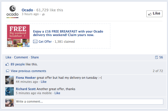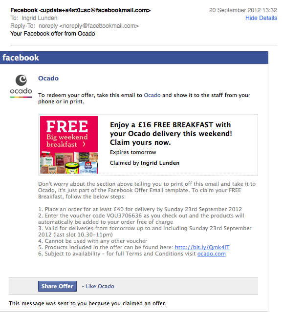 I have yet to see a Facebook Offer with a barcode but did see one with another tracking code — from UK online supermarket Ocado. Below is what the email confirmation looks like when you accept an Offer — meaning it doesn’t look like Facebook is yet making the offer an instantaneous option, redeemable straight from your newsfeed.