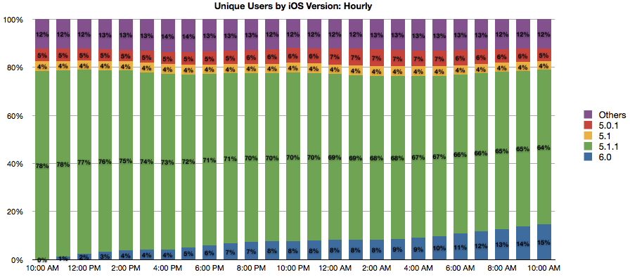We just reported that Apple’s iOS 6 saw an adoption rate of around 15 percent according to Chitika, and now Chartboost has provided numbers that back up that uptake. Chartboost is also seeing 15% uptake on its network, with users coming on board at an average rate of about 1 percent every two hours or so, with spikes around quitting time on Tuesday and picking steam again early Thursday morning.