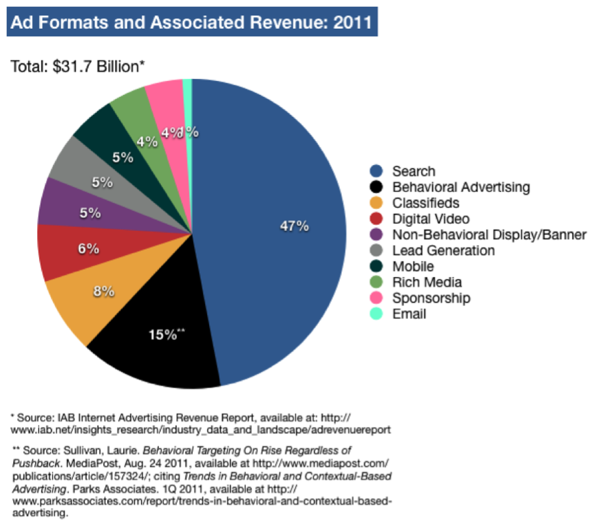 But according to the Interactive Advertising Bureau (IAB), the online advertising industry had revenue of $31.7 billion in 2011, and only about 15 percent of that, $4.9 billion, came from online behavioral advertising (OBA), ads that target consumers through personal information-powered tracking techniques and that are causing the privacy controversy.