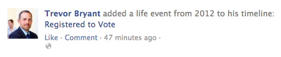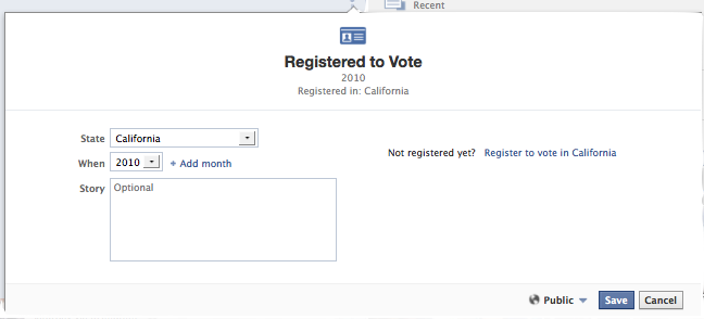 Facebook already offers a geo-personalized link to your state’s online voter registration website (if one exists) when you go to add the Timeline event. A great start. But Facebook should consider going the next step and showing those same links on the actual news feed stories generated by the Timeline events, so friends can get set up to make their voices heard in November.
