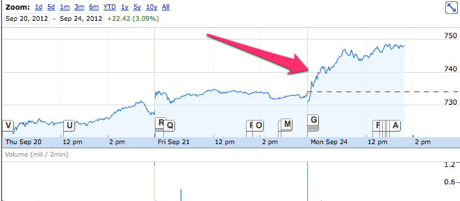 I know, I know. You’re tired of hearing about Apple Maps in iOS 6, but it’s a hot topic. Because of it, Google is being discussed in the news more and more. The fruits of that labor is now reflected in its stock price, which has surged to an all-time high of $747.90.