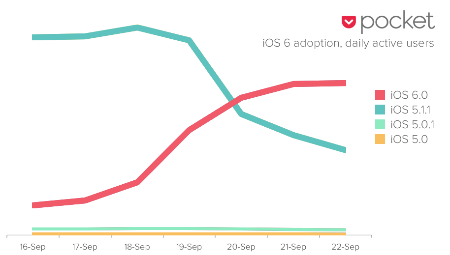 The above chart shows the proportion of daily active Pocket users on each of the Apple iOS versions. By the end of this weekend, 63% of our iOS users were already on iOS 6.