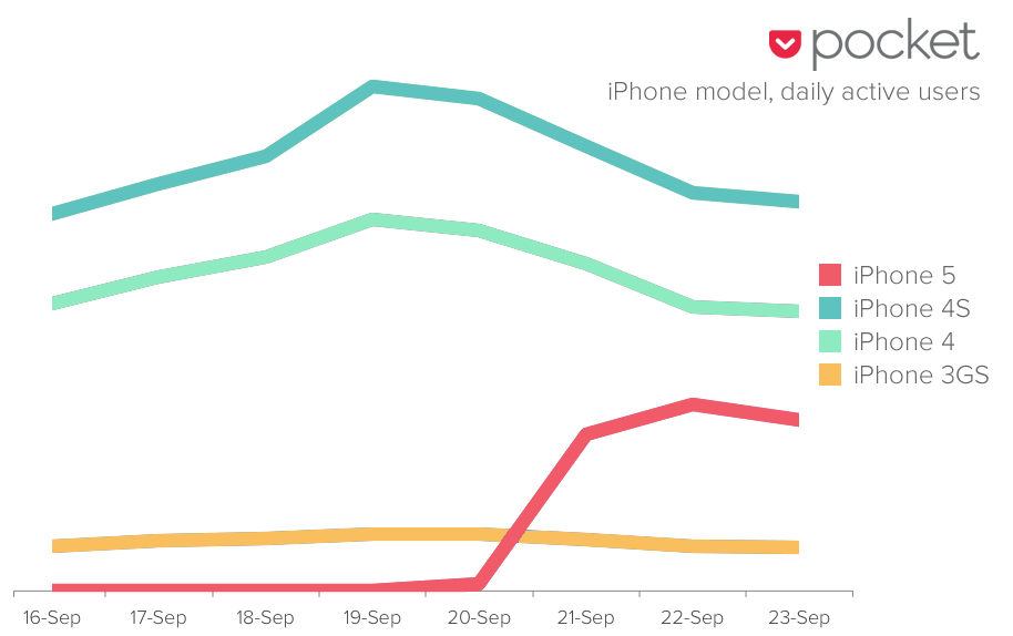 Pocket users are also snapping up the iPhone 5—not a surprise given the latest sales numbers. Over the weekend, 20% of Pocket’s daily iPhone users were accessing Pocket from an iPhone 5. Of course, some of that popularity can be attributed to promotion of Pocket alongside the new device, but we’ll continue to keep a close watch on its popularity.