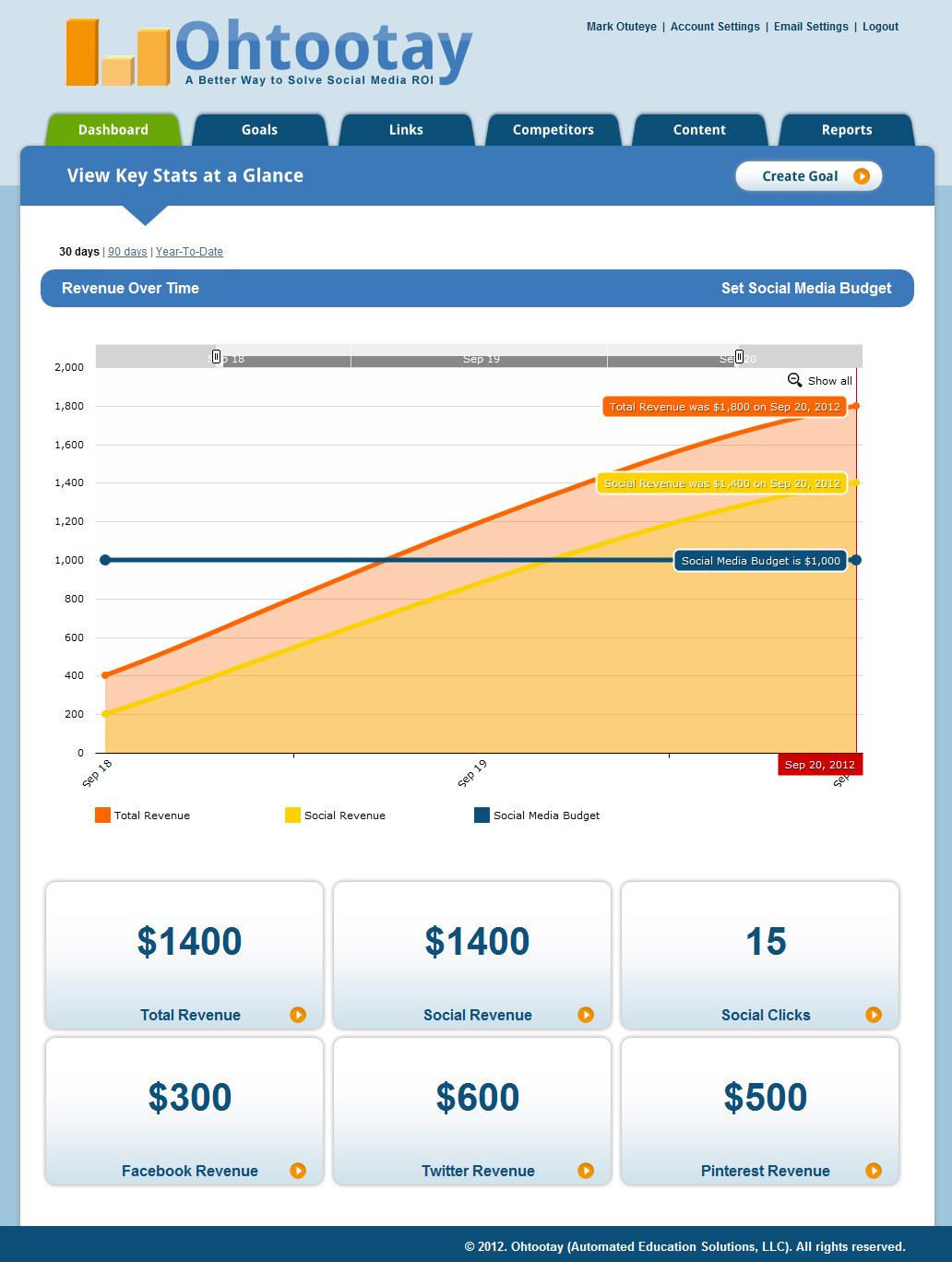 Ohtootay has been operating in private beta with about a dozen testers for the past three months, but is today available to all. There’s a 30-day free trial, and then a $399/month/user charge. Going forward, Mark says the next addition will be an option that lets marketers track their profitability by allowing them to add their social media budgets to the platform. That will show them not just the dollar amounts of sales, but what it took to get there.