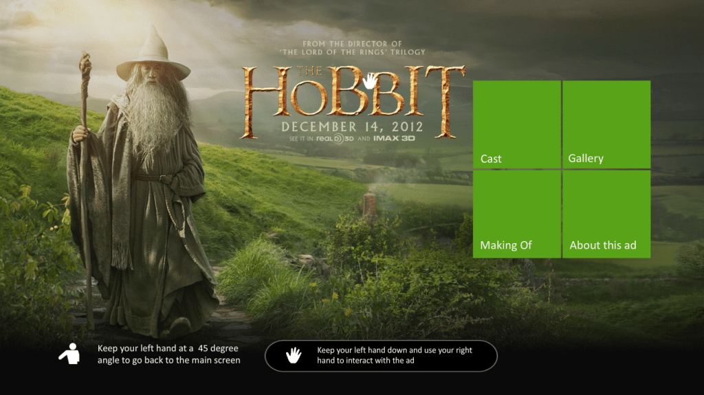 Brainient’s first Kinect-friendly ad is for the forthcoming film The Hobbit. It makes use of the Kinect controller to add interactive elements, allowing viewers to use hand gestures such as swipes and waves to interact with the video advert by, for example, viewing a photo gallery or reading cast biographies.