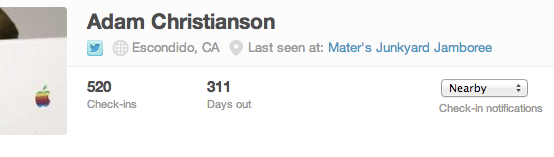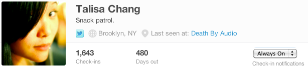 The setting itself can be found on your friend’s profile on foursquare.com. I’d be careful with how many people you add this “Always On” setting for, because you could get nailed with a zillion notifications quickly if your buddies move around a lot. There are other choices like the popular “off” or “nearby.”