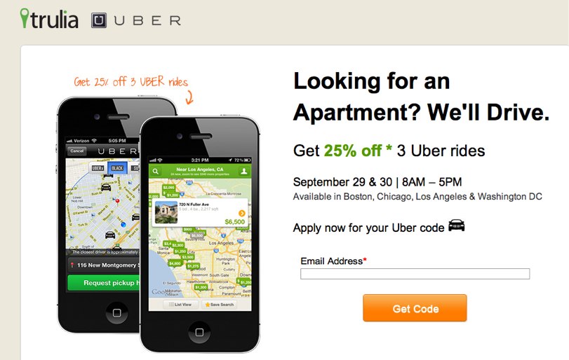This weekend, on September 29th and 30th, Trulia and Uber will be hosting a first-of-its-kind promotion, allowing prospective renters who are looking for apartments to receive a 25 percent discount on 3 Uber rides.