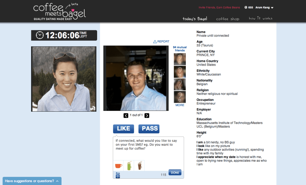 Like competitor PlentyOfFish.com, Coffee Meets Bagel offers its service for free, but it also uses a freemium model based around virtual credits to provide users with perks liek the ability to unlock the identity of mutual friends you and a match share on Facebook. These can be earned by users through various tasks, but also purchased directly, and that represents the site’s primary revenue for the time being. With enough traction, however, it’s easy to see Coffee Meets Bagel selling promotional opportunities to the businesses it partners with for member gifts and rewards.