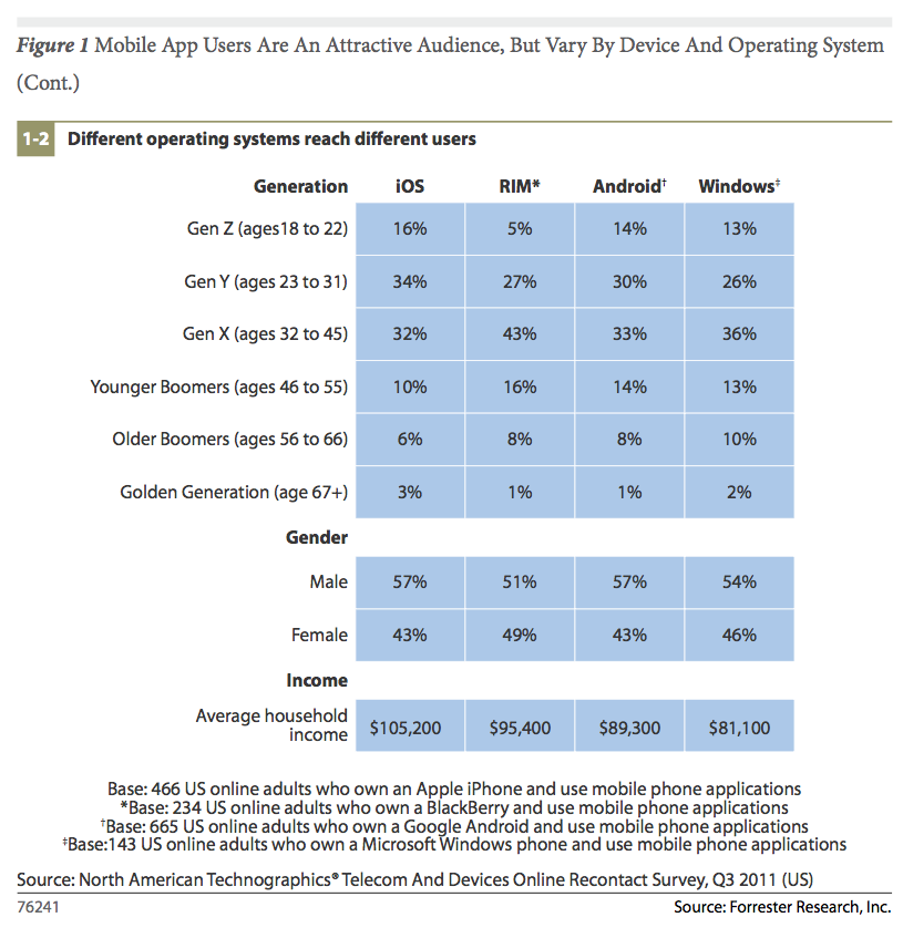 According to a new Forrester Research report, among U.S. mobile device users, those who use apps tend to be younger and more affluent than those who stick just to the web. Nearly one-third of those who use mobile apps fall between the ages of 23 and 31, and another third are in the 32 to 45 category. Usage varies by OS, however, and Apple’s iPhone app audience are generally younger and better off financially, while those on Android tend to be older and less moneyed.