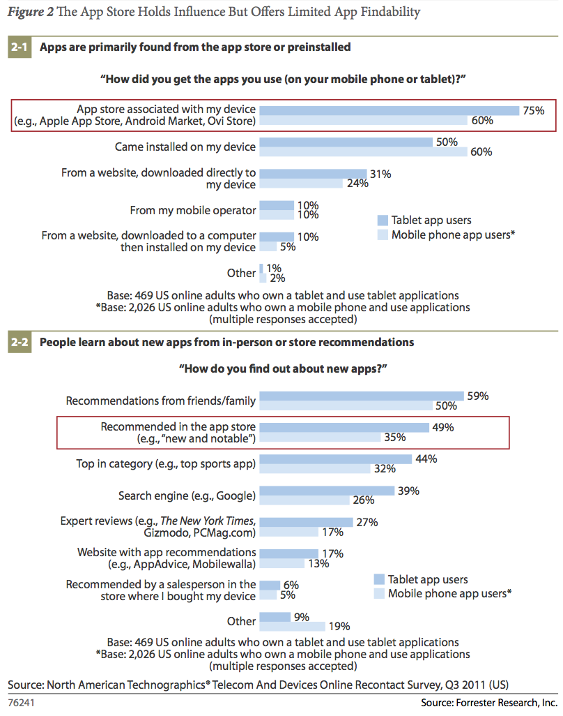 Forrester also provided insight as to how users find the apps they’re using. Most go through the legitimate storefronts on their device, like the Apple App Store and Google Play, but pre-installed apps represent a very large piece of the pie, as you can see below. People also tend to find out about apps mostly through word of mouth, according to the report, with recommendations and featured spots in App Stores coming in next. Search actually represents a relatively small piece of the discovery pie, and it’s unclear yet whether changes to the App Store on iOS will improve or decrease the chances an app has of being found through that mechanism.