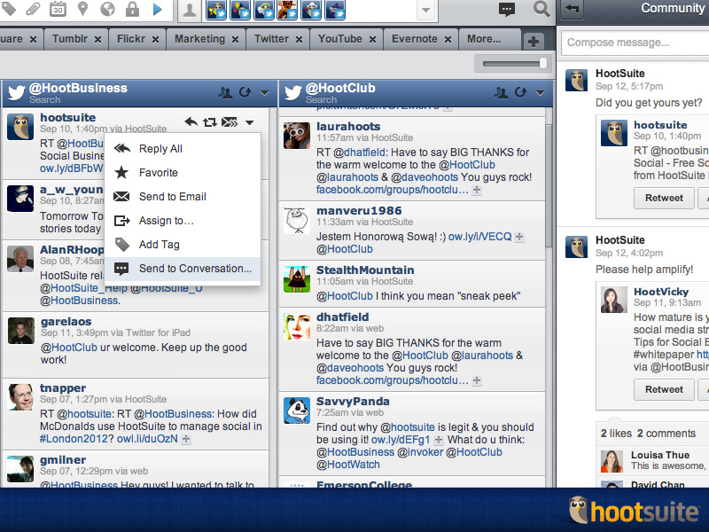 And this is how it looks. As you can see, those who monitor HootSuite for interactions with users/consumers can instantly select particular tweets/posts/status updates and send them directly to a real-time conversation.