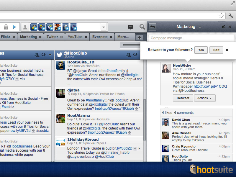 (I write “yet” because from what I understand Holmes and HootSuite have big ambitions to keep growing the product and expanding the whole dashboard functionality even more. That includes integrating more social media platforms to engage in and monitor (recent additions include Instagram, for example) but also more functionality. The recent purchase of Seesmic will add new users to the platform to help build up the scale of that operation.)
