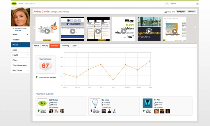 With the Klout-style service, influence is measured in the context of work. Klout measures updates from social networks. Tibbr looks at the user’s activity in the context of work to build a score.