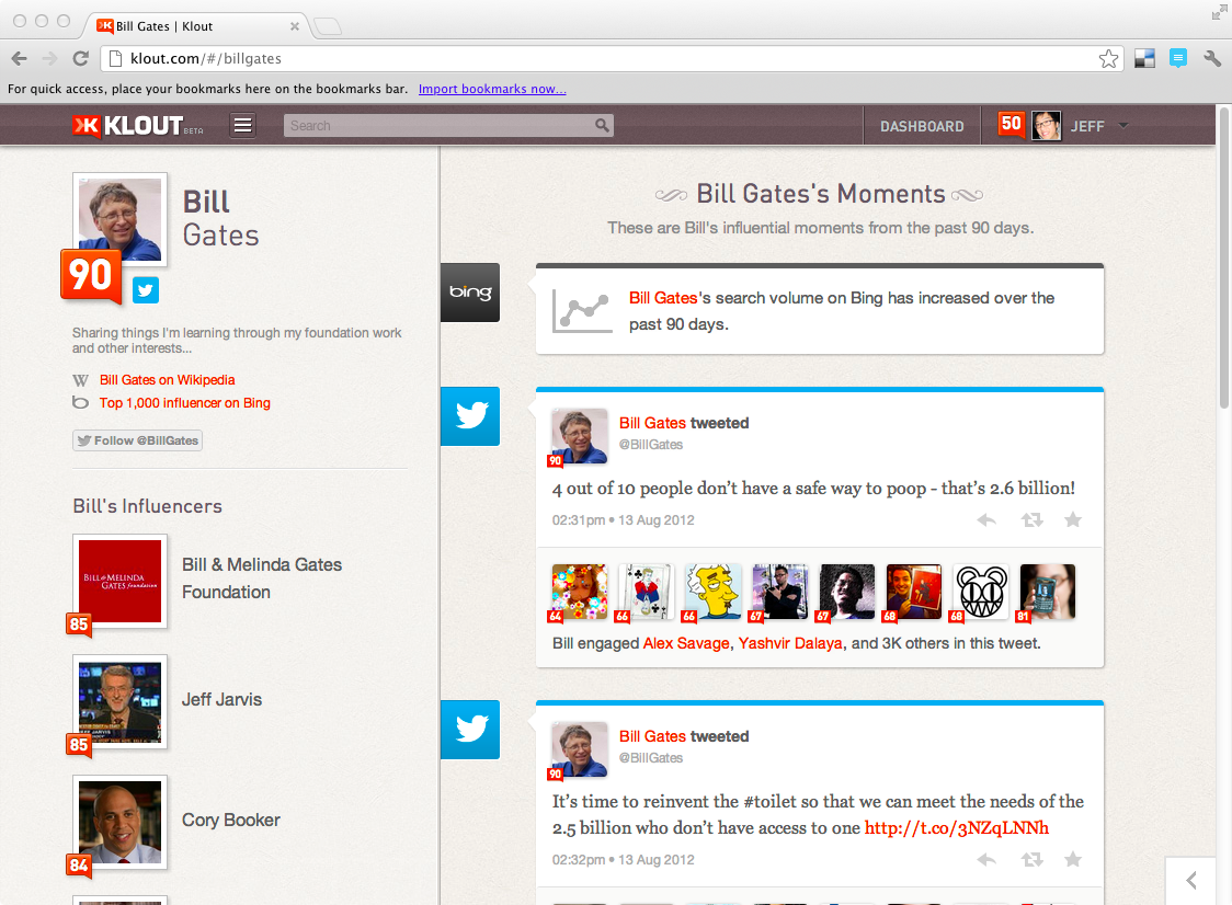 Meanwhile, search data in Bing will now begin contributing to Klout rankings.
