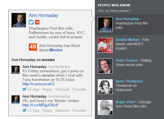 For now, experts will get a boost in Klout whenever they show up in “People Who Know” for queries. But raw search data will also become part of the mix. “Let’s say you write an article,” Klout chief executive Joe Fernandez explains, “and that article appears when somebody does a search, then the user clicks through. We’ll associate that click with your [Klout] name.”