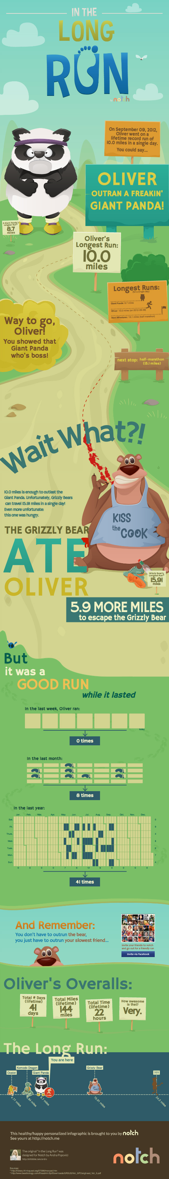 The images show off examples of advanced runners’ achievements (celebrating their endurance), while encouraging non-runners and beginning runners by rewarding them for reaching shorter distances. Every time the user hits a new milestone, the infographic adjusts itself to show another set of graphics and presents a new milestone to aim for.