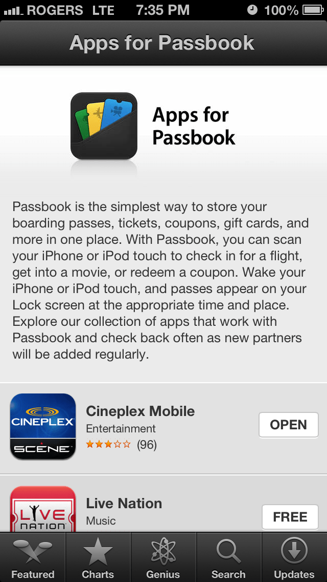 Passbook is the simplest way to store your boarding passes, tickets, coupons, gift cards and more in one place. With Passbook, you can scan your iPhone or iPod touch to check in for a flight, get into a movie, or redeem a coupon. Wake your iPhone or iPod touch, and passes appear on your Lock screen at the appropriate time and place. Explore our collection of apps that work with Passbook and check back often as new partners will be added regularly.