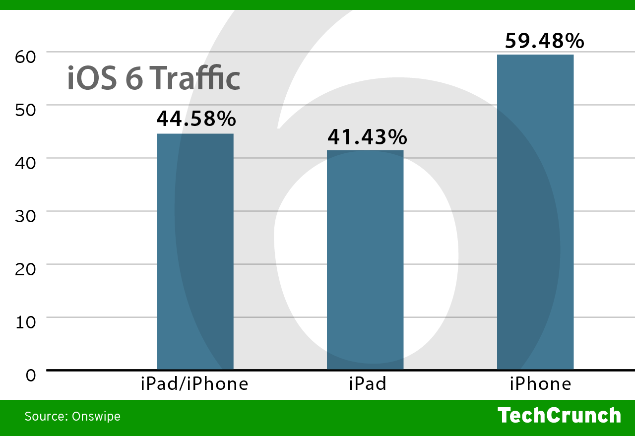 Adoption of Apple’s iOS 6 continues to trend upwards, with touch-friendly website conversion provider Onswipe seeing more users flocking to the newly-released platform, despite its apparent shortcomings. Based on a sample of 100,000 users coming through Onswipe’s partner sites Friday morning, the company is seeing 59.43% of iPhone traffic from iOS 6 devices, and 41.3% of iPad traffic coming from those who’ve upgraded to the latest version.
