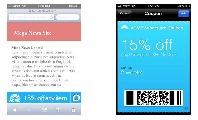 Let our Passbook obsession continue! Since the debut of Apple’s pseudo-mobile wallet in iOS 6 earlier this month, the extended developer community has rushed to deliver value-add solutions built on top of the platform. There have been Passbook loyalty card and coupon creation apps, tools to send Passbook mobile coupons via SMS, and now this – a solution that turns a Passbook pass into a 320×50 mobile ad unit that can be shown anywhere.