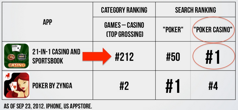 Although it can be a challenge to get the keywords right, doing so can actually mean a boost in discovery as users begin to craft more targeted search queries. For example (see below), an app that ranks low on the charts for “poker” might be in the number one position for “poker casino.”
