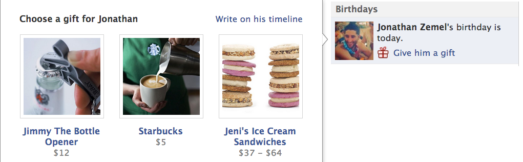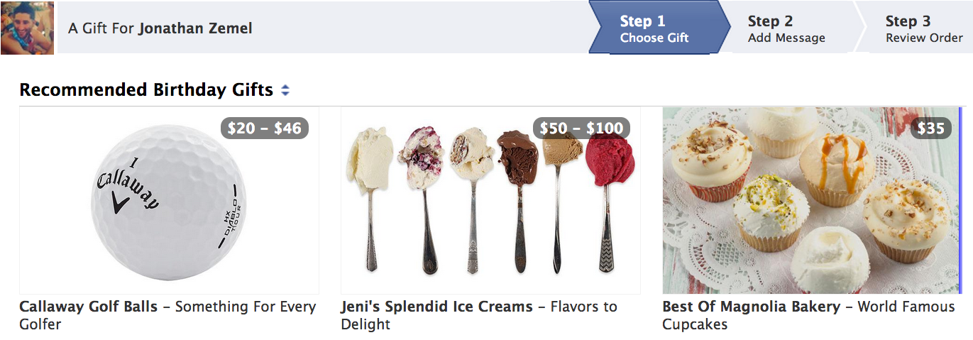 And then on Thursday Facebook launched Gifts, its entry into the e-commerce market that suggests and lets users buy real gifts and digital gift cards for friends. It earns a percentage of each sale.