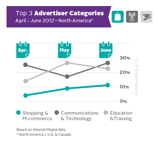 As for which categories of apps are growing in popularity, Mojiva found that mobile gaming, entertainment and social networks were most popular in the U.S., with 23%, 20% and 11% of total ad impressions, respectively. Mobile shopping and m-commerce were also growing – the fastest of any category – up from 4% in April to 11% of total ad impressions in June.