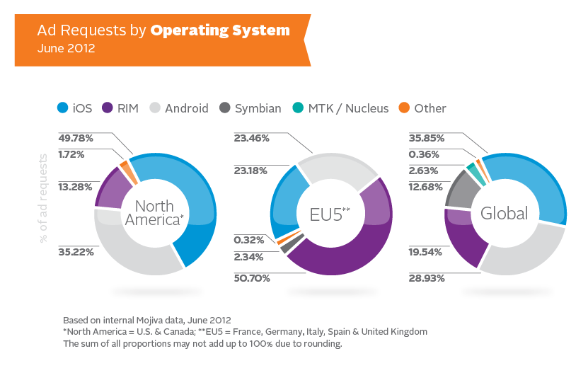 As for the iOS vs. Android vs. BlackBerry battles: globally, iOS accounted for 36% of ad requests, followed by Android (29%), then RIM (20%). RIM accounted for the majority of the ad requests in the EU5 (the five European countries listed above) at a surprising 51% share, while Android and iOS were at 23% each.