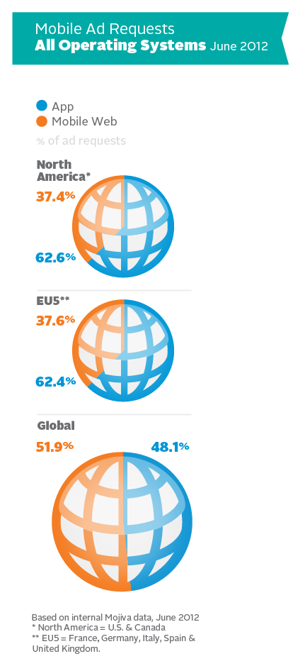 With the growth of the mobile app ecosystem, some may think that advertising on the mobile web would suffer, or at least not be as worthwhile. But Mojiva found otherwise. On its network, there has been a steady rise in mobile web ads, up from 27% in February 2012 to 37% in June. In North America, 62.6% of mobile ad requests are in-app, and 37.4% are mobile web. In France, Germany, Italy, Spain and the U.K., 62% of mobile ad requests are in-app and 38% are from the mobile web. In other words, very close percentages in those markets. But globally, the distribution is more even – 48.1% of ads were in-app vs. 51.9% on the mobile web.