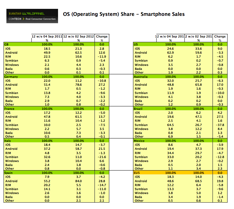 The big question is whether we should be looking at the U.S., or Europe, as a bellwether for the wider market. My personal guess is that both are significant: we’re seeing a growing split, with Android getting ever-stronger in the low-cost smartphone division, and Apple getting better at cornering the high end, a position it’s likely to continue to hold in the next set of figures, which will include sales of the iPhone 5. That’s partly borne out by the fact that in Brazil and Mexico, Android saw some of its very highest gains, respectively growing share of sales by 47% and 37%. Although Apple’s been effectively creating “low end” handsets by continuing to circulate older models at lower prices, it remains to be seen whether the company decides to extend that to actually launch “nano” new handsets intentionally pared down and costing less to target emerging/developing and more price-sensitive markets more directly.