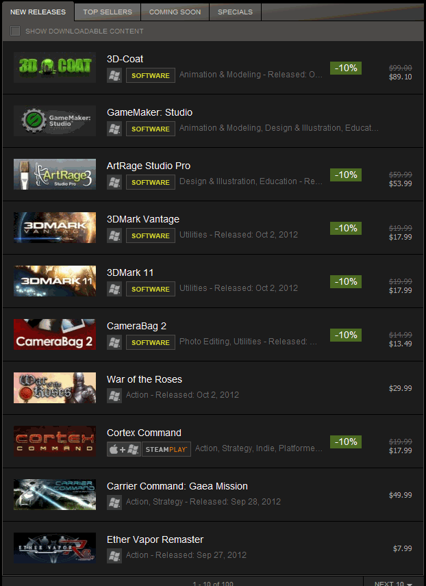 Graphic and pro applications are currently dominating the selection, with ArtRage Studio Pro, 3D-Coat and 3DMark benchmarking software already available. It might be a sign that Valve is focusing on high-end, niche applications instead of cheap, single purpose apps. Free apps are supported as well.