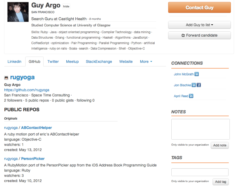 Entelo Search, the company’s second product, is a searchable database of 300 million profiles that presents a three-dimensional look into each candidate based on data aggregated from GitHub, Stack Overflow, Twitter, Quora, Dribbble and GrabCad — to name a few. Each of these data funnels is easily accessible via icons, so recruiters can see how many questions a candidate is answering on Quora (and how well), what they happen to be tweeting about and what projects they’re showing on GitHub.