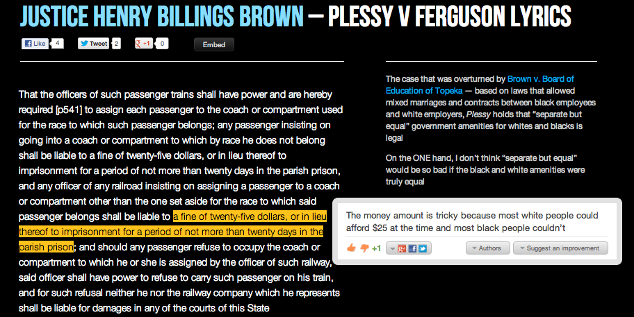 It also has huge potential to demystify historical documents which now lack context. Horowitz tells me, “the importance of the meta-knowledge is extremely big over time.” For example, he tells me how a Rap Genius annotation showed him that the difference in value of $25 in 1896 compared to now is critical to understanding the famous Plessy v. Ferguson case that permitted racial segregation:
