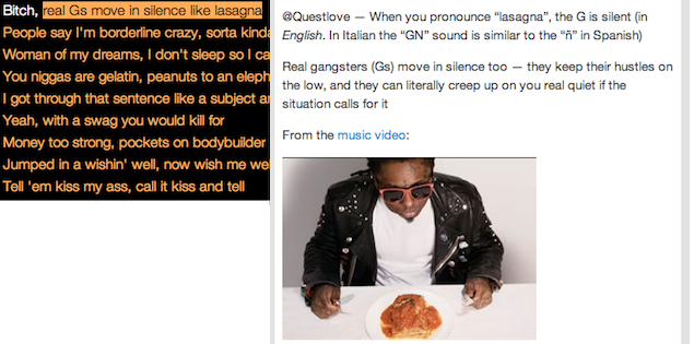 That might seem like a leap of faith, considering right now Rap Genius is just an isolated website where users submit text, then annotate it with pop-up footnotes. It’s a huge help with rap lyrics that are chock-full of new slang, heavy metaphor, and obscure references. It’s also got other works like poetry, legal documents, rock songs, and religious texts.