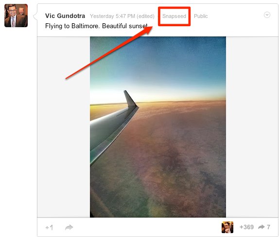 Google’s Vic Gundotra flew to Baltimore yesterday and happily shared a photo he took during his flight on Google+. Nothing special there, but what’s interesting is that he sent the photo to Google+ using Snapseed, the – until now – iOS-only, photo-sharing app and Instagram competitor that Google acquired last month when it bought Nik Software.