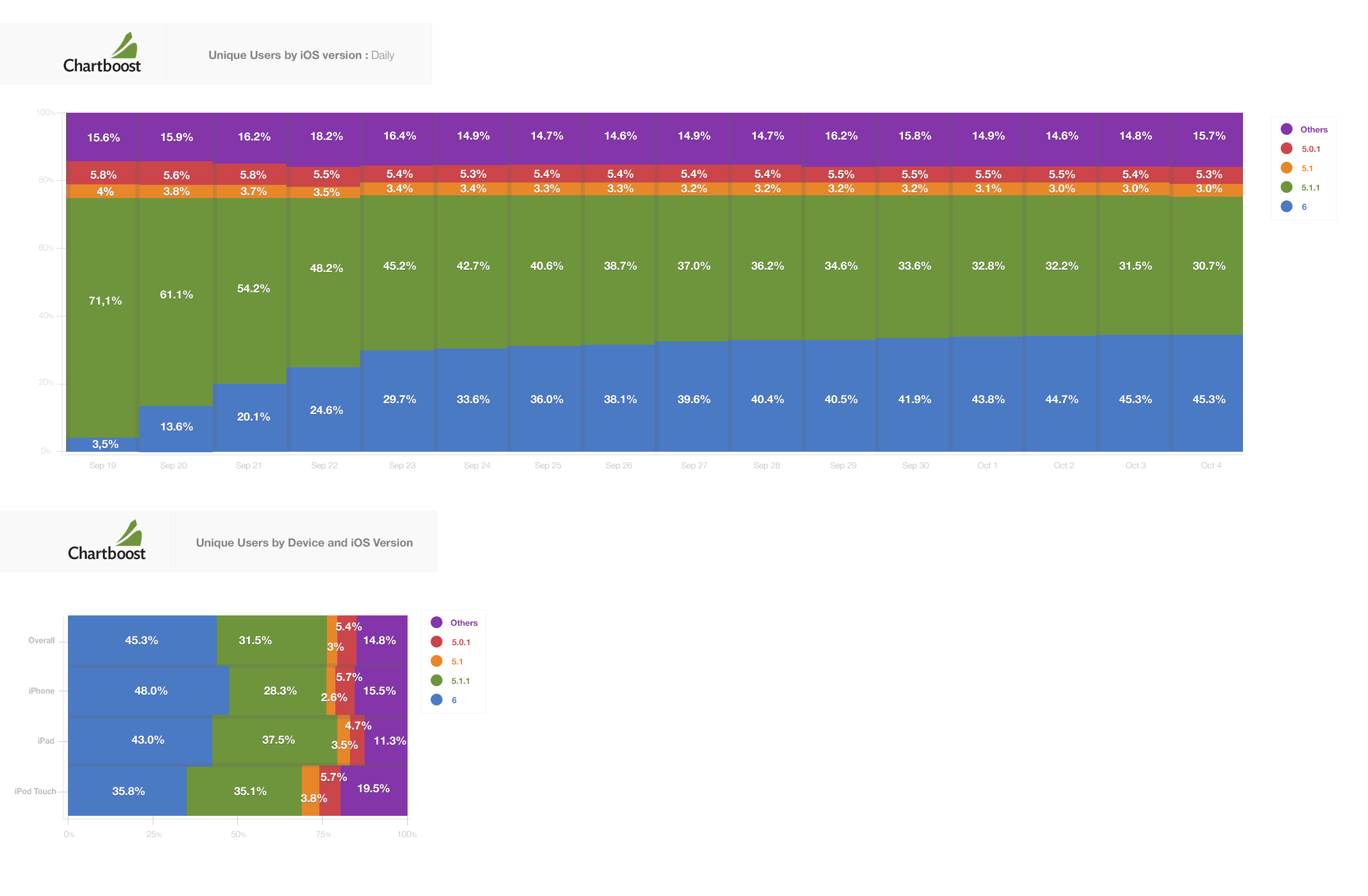 As with other data we’ve seen from different sources, Chartboost shows the iPhone out ahead in terms of iOS 6 adoption, with the iPad coming in second and the iPod touch as the laggard in terms of hardware being upgraded. But whereas we’ve seen claims of over 60 percent adoption from Onswipe and Chitika, Chartboost says that’s much lower. Chartboost’s sample pool covers millions of unique devices through its publisher’s apps every hour, however, so its sample size is significant.