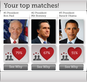 The end-goal is to match users with the right politician (the one who aligns closest with your political views) and does so by prompting them to choose the three issues that matter to them most. The site then asks an additional ten questions, using your responses to determine your political match. If that doesn’t satisfy, users can go through each question, digging down into the data and compare each politician’s stand on the particular issue.