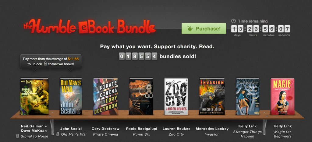 This bundle has sold more than 18,000 units already and you can download the books in DRM-free epub, mobi, or PDF format. You can also send them directly to your Kindle. The bundle is worth $52, but the average donation has been $11 so far, which means you can receive the Scalzi book and a the Gaiman graphic novel for $12.