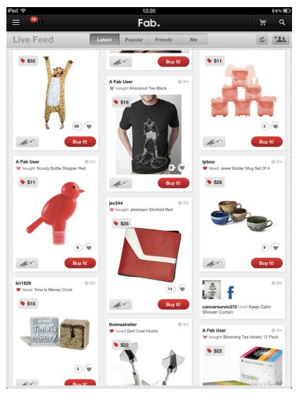 Fab took into account the touchscreen to make sure the experience was complementary for both iPhone and iPad users. The iPad app has been completely redesigned to give users a more touch-friendly, leanback experience for browsing. The company also added social feeds to allow users to see what’s most popular right now on the site in terms of purchases, the latest arrivals, what friends are buying and sharing, and more.
