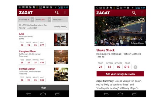 In total, the app gives users access to reviews of about 30,000 restaurants and lets you filter your searches by cuisines, Zagat scores, cost and dining features like outdoor seating. Users can also post reviews right from the app. Public reviews that you post from the app will appear on Google+ local, either under your full name or as “A Zagat User,” depending on your preferences.