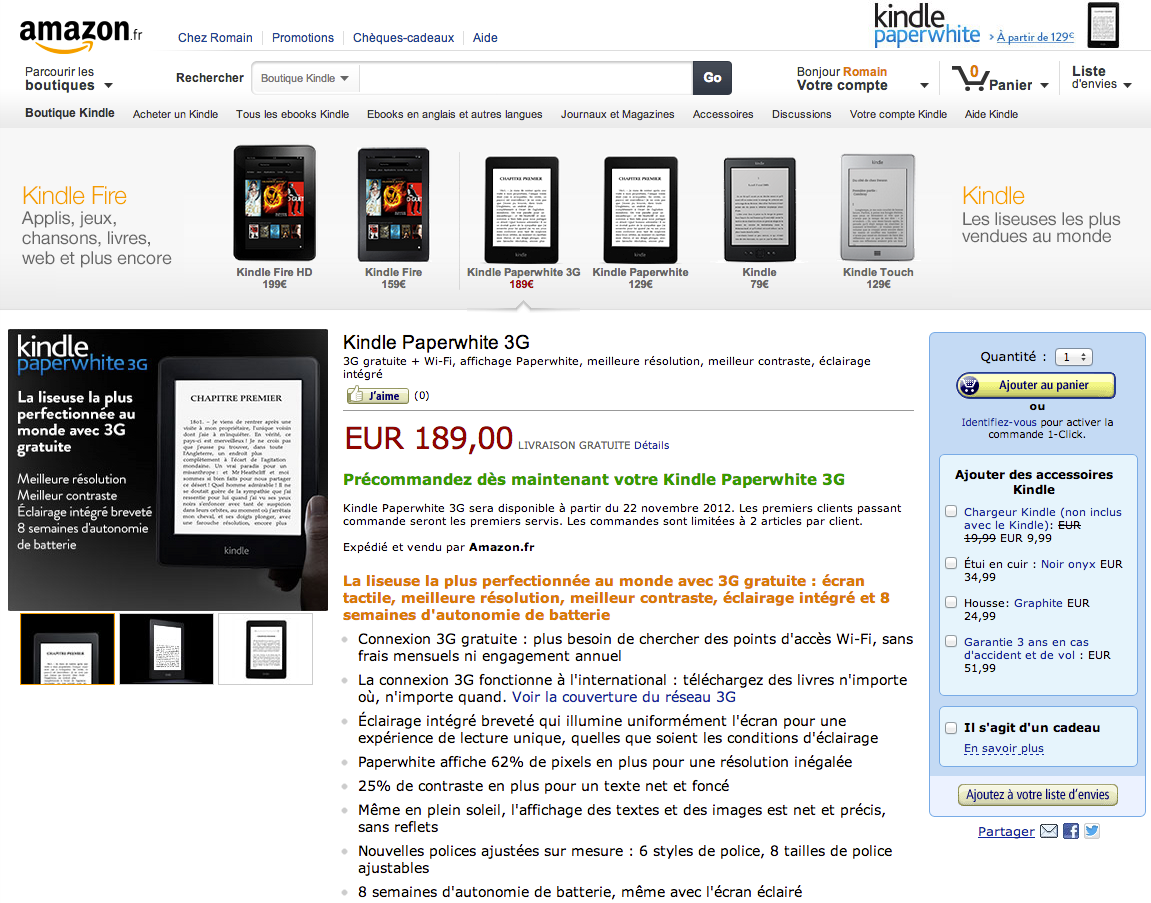 Both the 3G and Wi-Fi only models are available in those countries. The Wi-Fi variant costs €129 or £109 (around $170, sales tax included) while the 3G version costs €189 or £169 (respectively $244 and $271). As special offers are not available in Europe, the Kindle Paperwhite will come without ads.