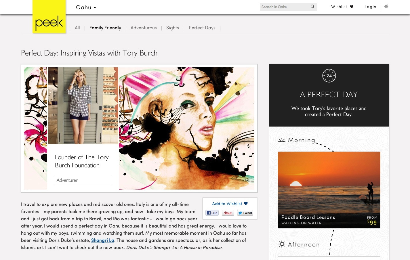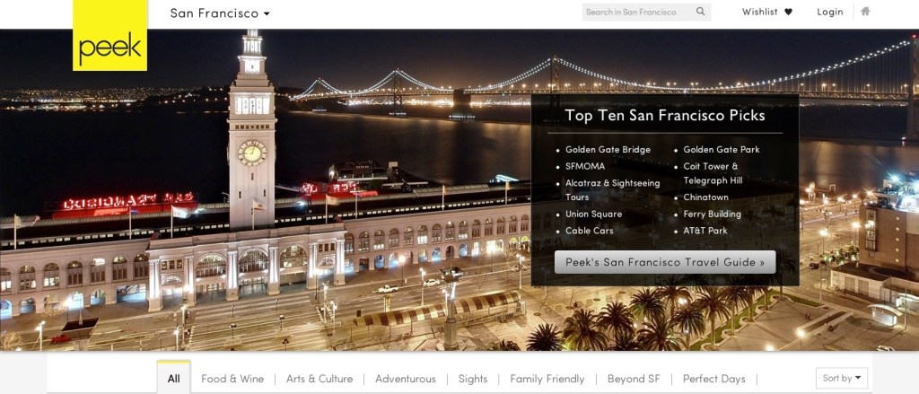 Peek aggregates information about dozens of activities that are available for travelers, both free and paid. It works with local vendors to allow users to book various activities directly on the site, rather than having to take note of what they want to do and then later buy tickets or pay offline, expediting the process for planning trips. In addition to all the editorial content that it’s produced itself, it’s also curated “Perfect Day” insider tips from celebrities such as Piers Morgan, Tory Burch, and French Laundry chef Timothy Hollingsworth.