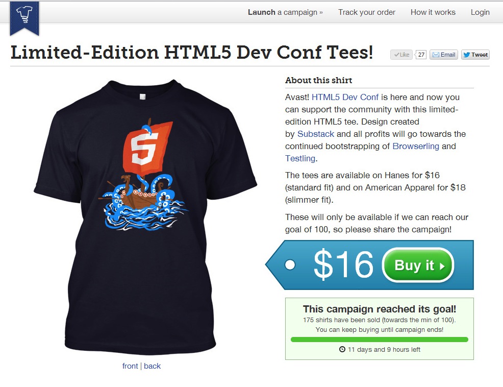 Now a team of seven, Teespring is a month away from releasing an API and widget that will allow shirt creators to embed campaigns on their own website. They’re also debating raising a venture round in order to grow further: Williams says he can see the company expanding to anything where it can control production and fulfillment – not just t-shirts and other promotional items. In fact, they’ve experimented with things like water bottles and hoodies and even snow globes. And they’ve even received some crazier requests – like those for surfboards and books.