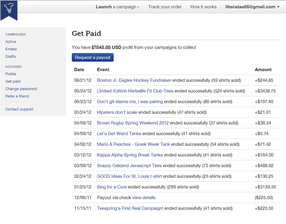 That’s when he got the idea for what has now become Teespring. He sat down with Stites-Clayton, a friend and coder, and in five or six hours, they had a website up and running where students could pre-order shirts via PayPal. They had the goal of selling 200 shirts, but they sold 450 and the site saw 3,000 uniques in just a couple of hours. More importantly, the inquires started rolling in via email. Other organizations, on campus and elsewhere, wanted to know: can you build us a website, too?