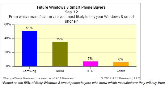Among them, it is Samsung that is getting the most Windows Phone 8 brand recognition at the moment, with more than half of all respondents (51%) saying that they would buy a Samsung phone, if they bought a Windows Phone 8 device: