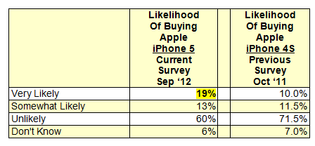 So to the results: ChangeWave found that some 32% of respondents said that they were likely to buy an iPhone 5 as their next smartphone — within that 19% said ‘very likely’ and 13% ‘somewhat likely.