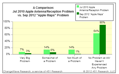 “In comparison to the iPhone 4 Antenna/Reception issue, the current Apple Maps issue is of marginal concern to iPhone 5/iOS 6 users,” ChangeWave writes. “Simply put, Apple Maps is not considered a problem by the overwhelming majority of users.”