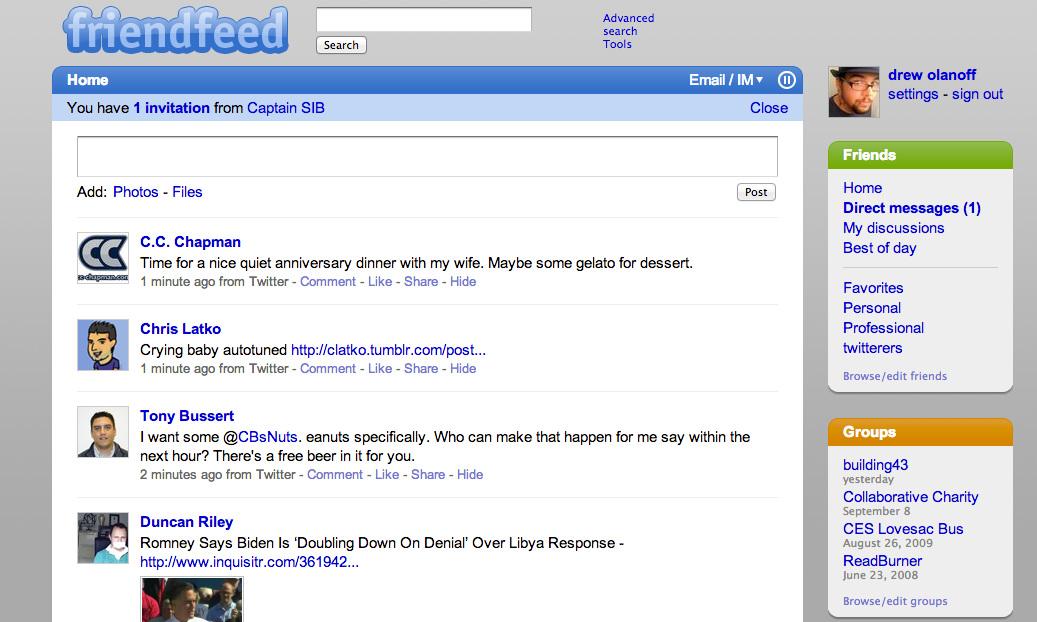 The idea of Friendfeed was that it was supposed to allow you to pull in ALL of your things from every site on the Internet. Your followers/friends/family could then go to the site and see it all in one place. Pretty smart. Until other cross-posting started. Soon, I saw someone post something on Facebook that got sent to Twitter and it would appear twice on Friendfeed. It was like some weird statusception infinite loop that made Friendfeed noisy and ultimately unusable.