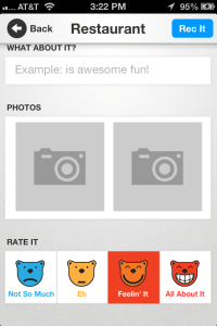To leave a review, you tap the “Rec It” button fill out a few details, and tap on a cute icon for the rating (“All about it,” “Feelin’ It,” “Eh,” or “Not So Much.”) And you can search reviews in the “Get Recs” section, or use “Direct Ask” to ping a friend about what they would suggest. Unfortunately, these requests only flow through Mouthee for now, but Pritzker says that they’ll add support for SMS and emails “Asks” in the future.